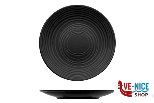 MODERNA COLLEZIONE IN STONEWARE NERO ARRICCHITA DA UN DECORO REATTIVO CONCENTRICO TON SUR TON. OGNI PEZZO E’ UNICO E DIVERSO DAGLI ALTRI.
