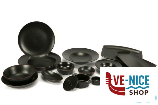 PIATTI ED ACCESSORI IN STONEWARE NERO, CON UN ELEGANTE BORDATURA RAMATA CHE DONA ELEGANZA AD UNA LINEA CHE SI ISPIRA ALLA TERRA ED AI COLORI DELLE ISOLE VULCANICHE