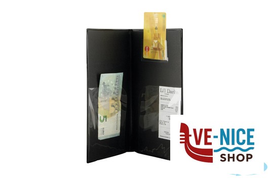 PORTA CONTO PVC NERO CON TASCHE INTERNE PER FATTURE, CONTANTI E CARTA DI CREDITO, FACILE DA PULIRE.