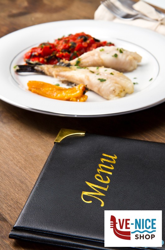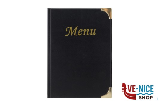 PORTA MEN IN PVC, CON SCRITTA “MENU” IN ORO STAMPATA SULLA COPERTINA. ANGOLI PROTETTIVI IN METALLO DORATI, FACILE DA PULIRE, DISPONIBILE IN DUE COLORI. QUATTRO INSERTI NON RIMOVIBILI INCLUSI.