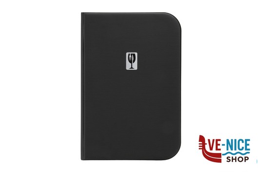 ESSENTIAL – PORTAMENU IN PVC A4 NERO CON MOTIVO RIGATO. PLACCA IN METALLO STILIZZATA SULLA COPERTINA. 10 INSERTI NON RIMOVIBILI CM 31,5X24 MC-ESA4-BL