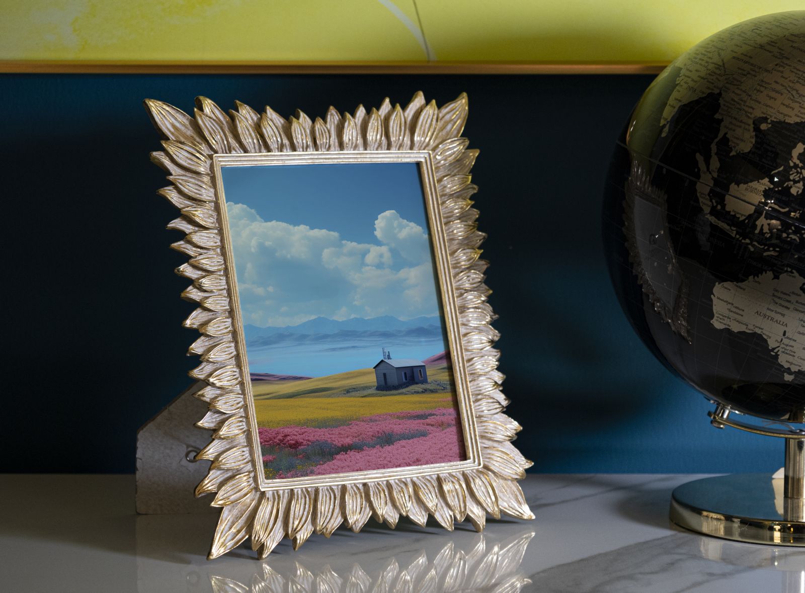 GLAMPOLYRESIN AND GLASSGOLDCORNICE RETTANGOLARE DA APPOGGIO IN RESINA DAL DESIGN COMPOSTO DA UN INSIEME DI PETALI DI FIORI. PUÒ ESSERE POSIZIONATA SIA IN ORIZZONTALE CHE IN VERTICALE. DIMENSIONI FOTO CM 15X20.INSIDE SIZES CM 15X20