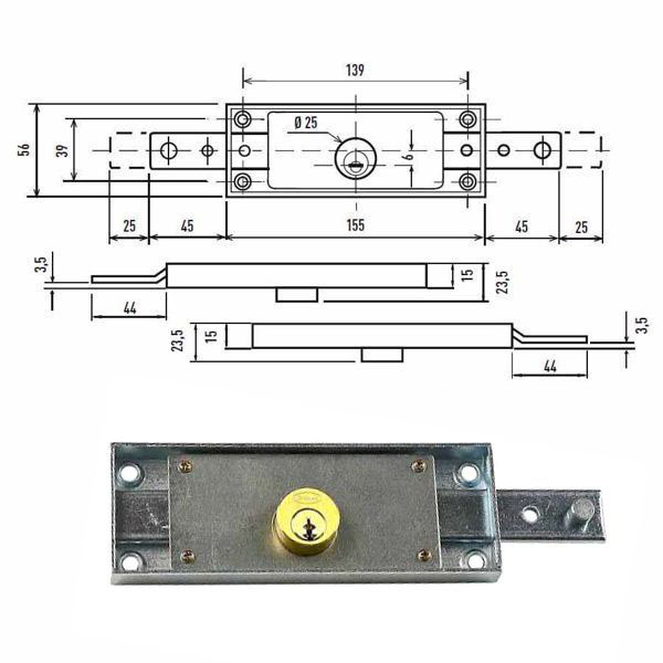 Serrature cilindro centrale serrande avvolgibiliPz 1 catenaccio piegato destro Pz 1 catenaccio piegato sinistro Cilindro ottone punzonato Scatola zincata – Funzionamento con ingranaggi Movimento chiave interno/esterno – 3 chiavi Scatola mm 155×56 – Sporgenza cilindro mm 8,5 Cifratura unica KA
