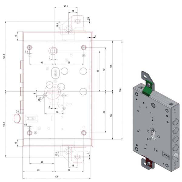 Serratura profilo europeo a planare triplice Foriprotettore mm 38 Catenacci laterali 4 pistoni e scrocco Interasse catenacci mm 28 Scatola 136×206 -Entrata 63 Cilindro non incluso