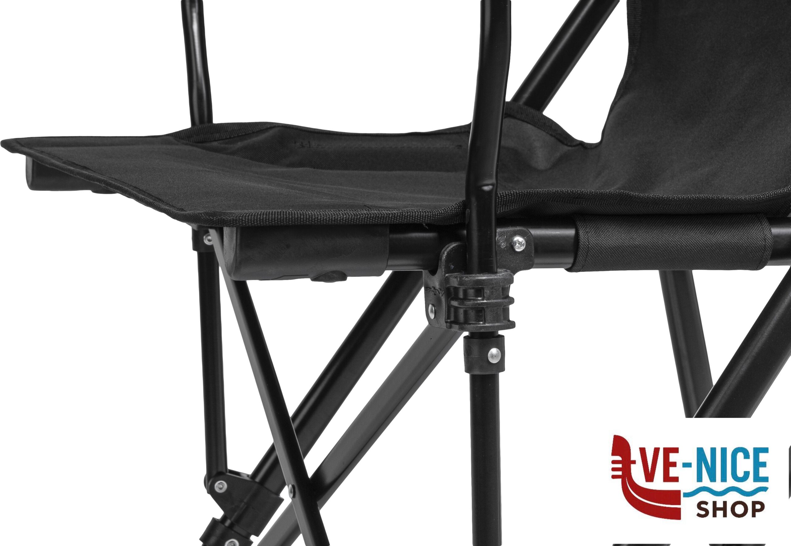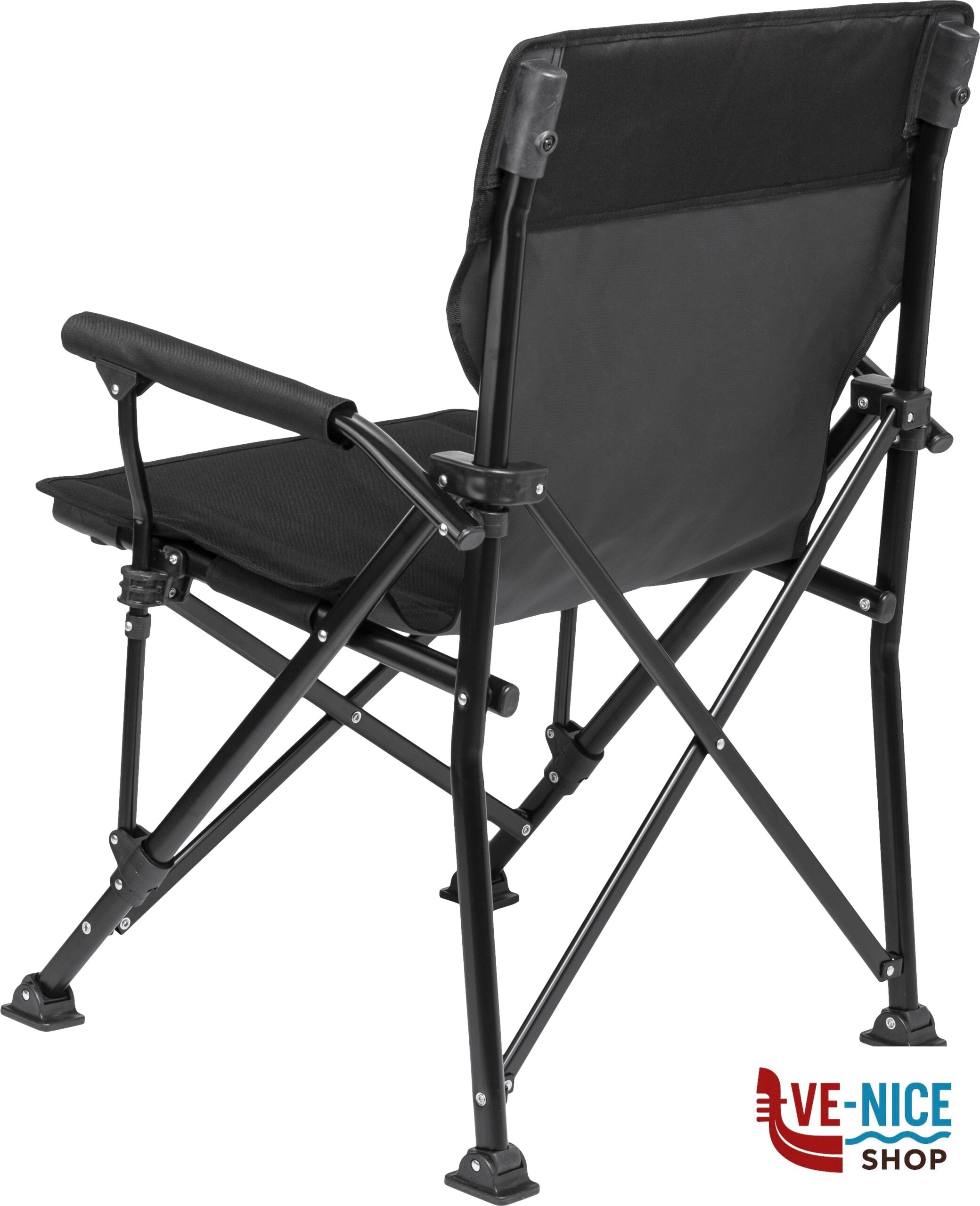 Comfortable folding chair with side seat support. High stability thanks to the oval shaped and powder painted steel frame and the large and adjustable foot bases. Sturdy coverage made of polyester.