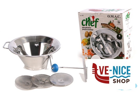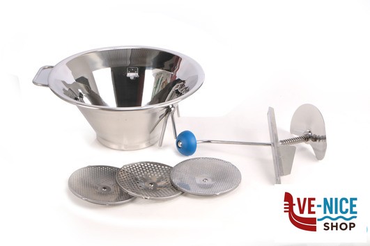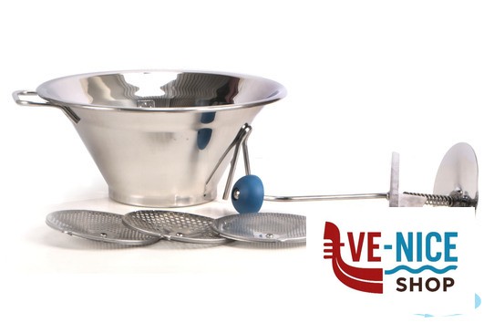 PASSAVERDURA ACCIAIO PROFESSIONALE DIAMETRO CM 33 CORREDATO DI TRE DISCHI E MANOVELLA.SISTEMA DI ADATTAMENTO A QUALSIASI CONTENITORE. PRODOTTO IN ITALIA