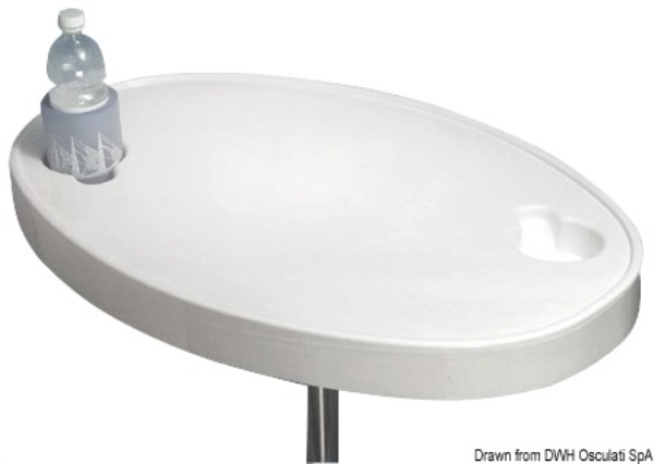 Sedili, tavoli, gambe, roll bar e portaoggetti Gambe e supporti tavolo Tavolo in ABS bianco Provvisto di alloggiamenti per tazze, bicchieri, bottiglie che, con appositi tappi in dotazione al tavolo, possono essere livellati per avere una superficie perfettamente liscia. Predisposto per l’accoppiamento con basi 48.418.03; 48.418.20; 48.418.22; 48.418.24 e di qualsiasi tipo con Ø massimo 178 mm le quali vengono incassate a filo nel lato inferiore del tavolo.