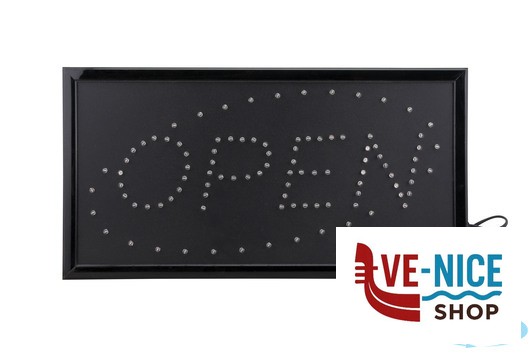 INSEGNA LUMINOSA A LED CON SCRITTA OPEN DA APPENDERE AL MURO O VETRINA. REALIZZATA CON LED LAMPEGGIANTI IN 2 COLORI. INCLUDE UN ADATTATORE A 220 V AC ED UN CAVO DI 130 CM.