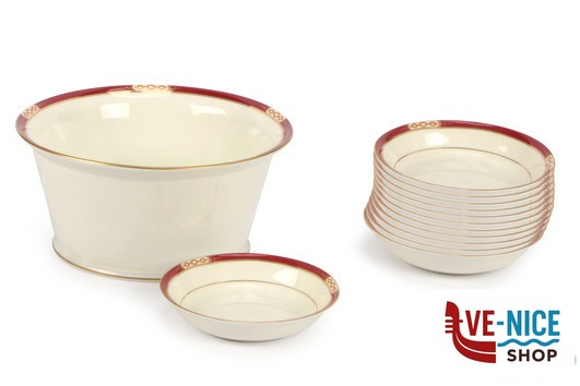 ELEGANTE E RAFFINATO SERVIZIO DA FRUTTA COMPOSTO DA 12 COPPETTE E 1 INSALATIERA IN PORCELLANA DECORATA. LA RIMA BOREDEAUX CON INSERTI DORATI RENDONO QUESTO ARTICOLO PREZIOSO NELLE OCCASIONI SPECIALI.