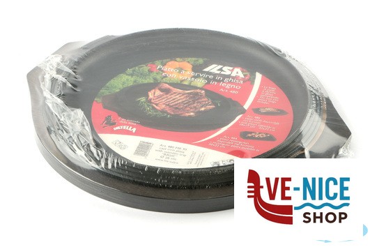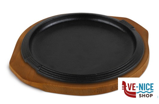 PIATTO A SERVIRE IN GHISA SMALTATA CON VASSOIO DI LEGNO. SI CUOCE IL CIBO SUL PIATTO DI GHISA E SI SERVE DIRETTAMENTE A TAVOLA. INDISPENSABILE PER CARNE E BISTECCHE!