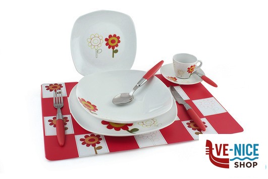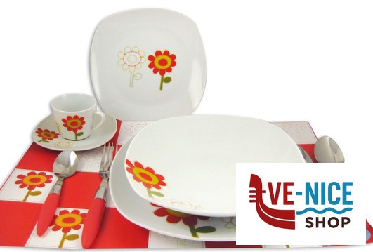 MODERNO SERVIZIO DA TAVOLA IN PORCELLANA DECORATA PER OGNI OCCASIONE COMPLETO DI TAZZE TOVAGLIETTA E POSATE. ART RESISTENTI IN LAVASTOVIGLIE