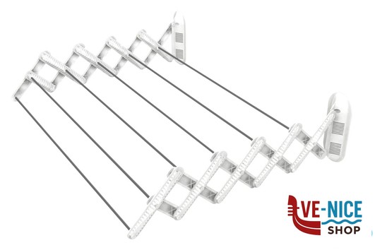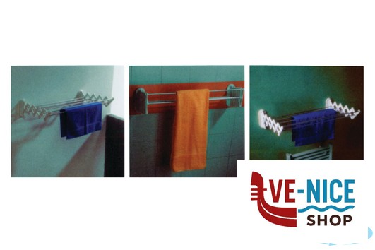 PRATICO STENDITORE DA PARETE IN ALLUMINIO E RESINA, SALVASPAZIO GRAZIE AL COMODO SISTEMA DI CHIUSURA E APERTURA A FISARMONICA, SPAZIO DI STENDITURA 6 METRI.