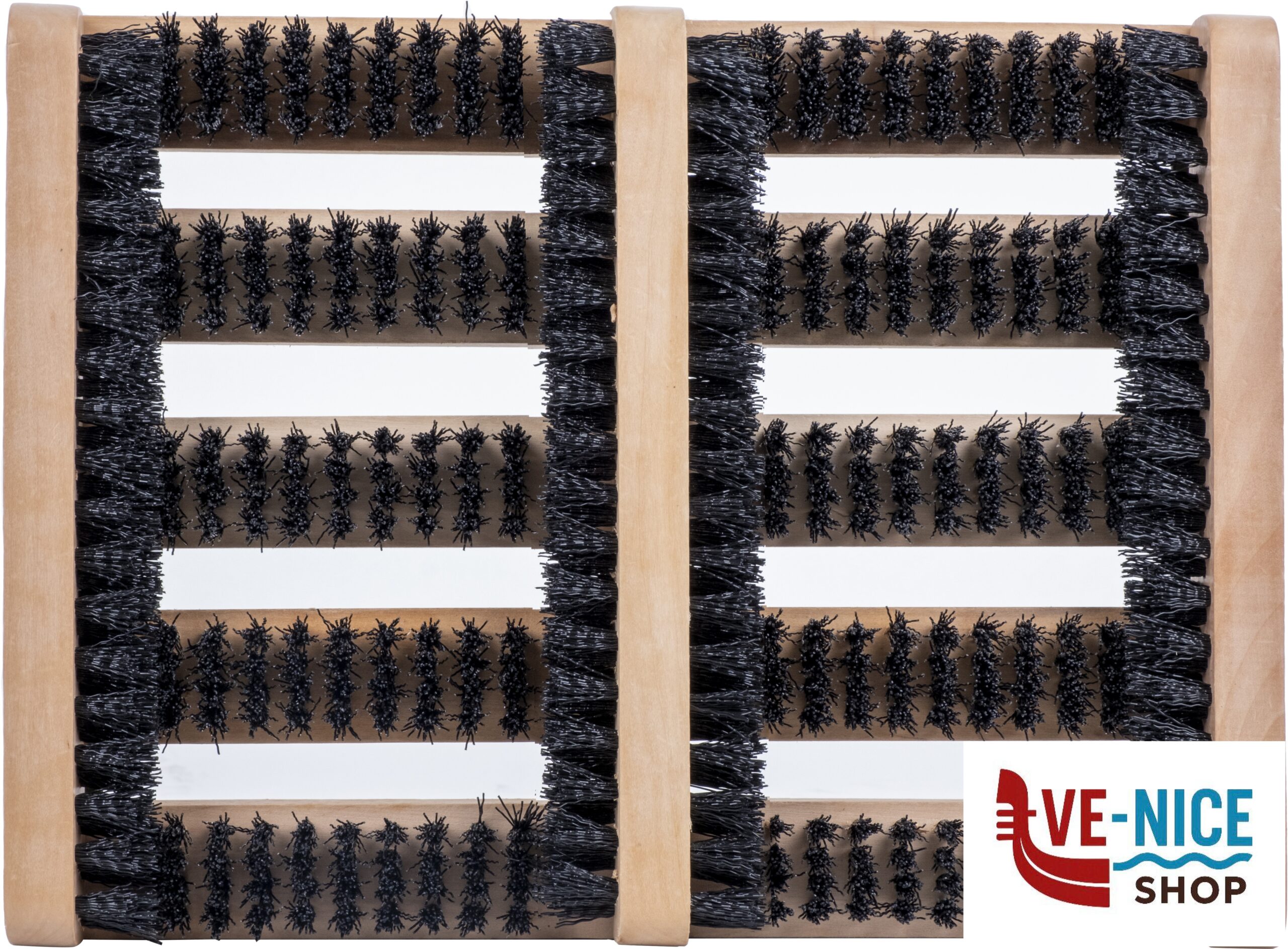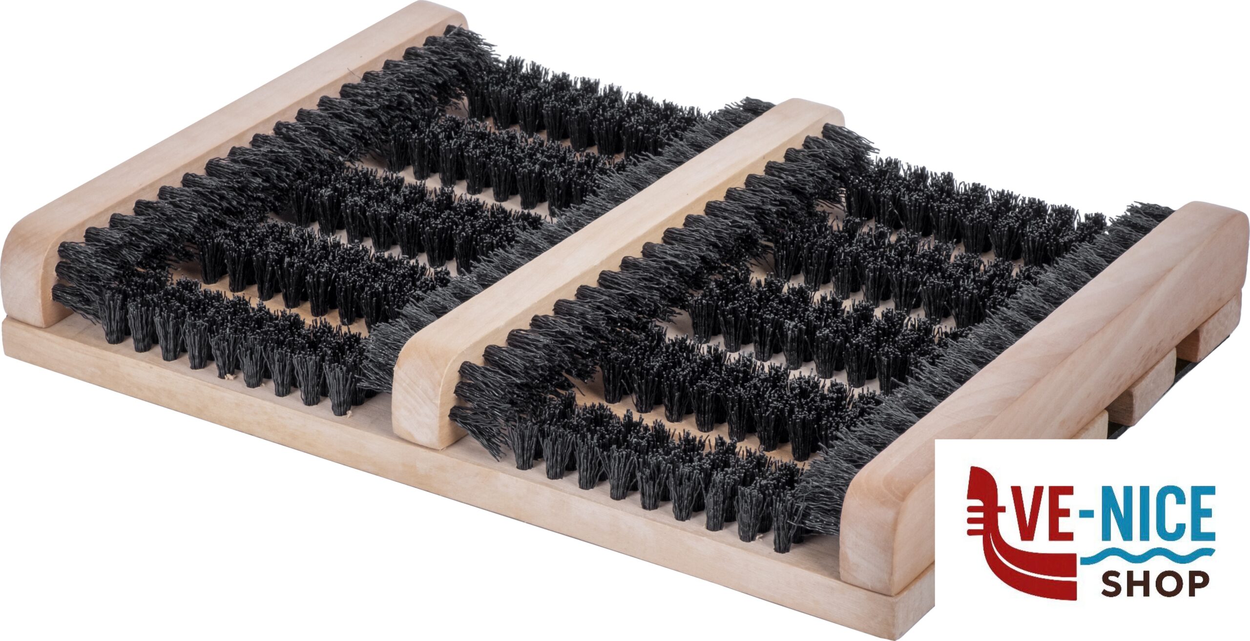 Zerbino con struttura in legno. Le spazzole applicate sulla parte inferiore ed ai lati favoriscono l’ottima pulizia di entrambe le scarpe.