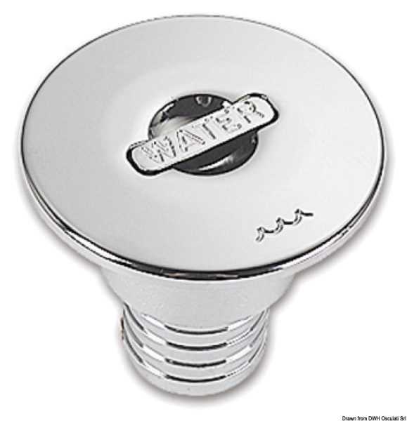 Tappi imbarco, portelli Vani e tappi imbarco Tappo di rifornimento in ottone cromato Speciale sistema di apertura che evita l’uso di chiavi, monete od altro. Progettati in modo che il tappo mascheri completamente la flangia avvitata, migliorando la tenuta dell’acqua. Versione con canotto di raccordo dritto o inclinato a 30° (da utilizzare quando il piano di rifornimento é inclinato, conforme ISO 8099/1 ). Completi di catenella interna, Ø massimo 88 mm. Sono tutti regolamentari RINA.