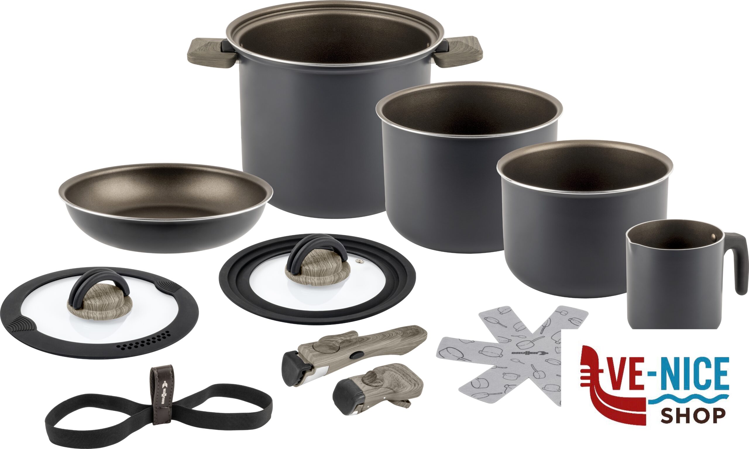 La popote Torralta è la soluzione definitiva per i proprietari di camper e barche alla ricerca di pentole efficienti. Questa collezione è stata sviluppata per cucine compatte e offre un rapporto ottimale tra superficie e volume per gestire maggiori quantità di cibo. Grazie allo speciale design dei bordi, le padelle incluse si appoggiano saldamente senza il rischio di scivolare. Tutte le pentole e le padelle sono realizzate con lattine di alluminio riciclato. La pentola esterna è dotata di manici pieghevoli per essere riposta in modo compatto e salvaspazio. Questo versatile set è compatibile con tutti i tipi di piano cottura, compreso quello a induzione. È incluso un manico rimovibile per le pentole interne.