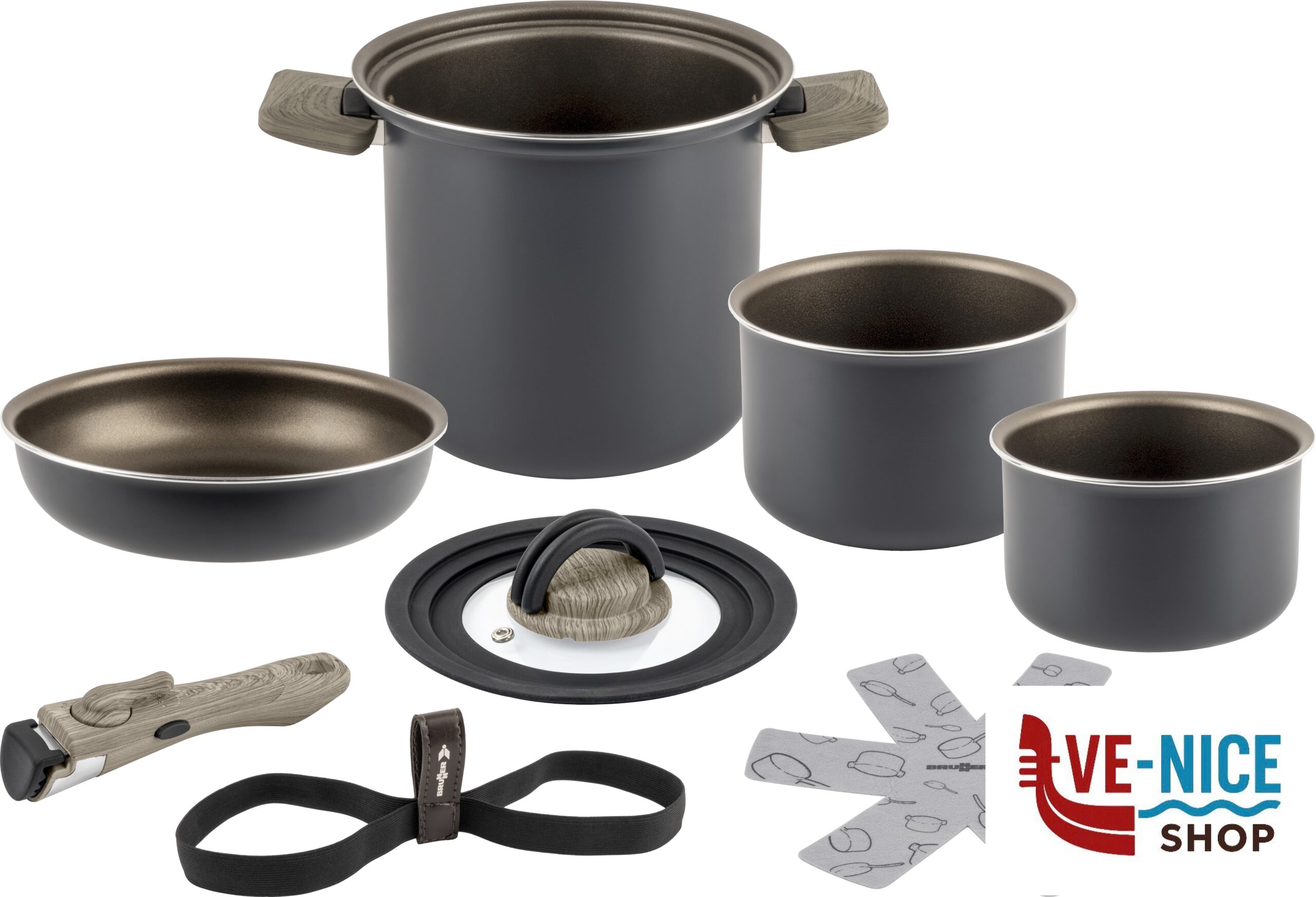 The Torralta stackable pot set is the ultimate solution for motorhome and boat owners looking for efficient cookware. This collection has been developed for compact cookers and offers an optimum ratio between surface area and volume to handle larger quantities of food. Thanks to the special edge design, the included pans sit securely without the risk of slipping. All pots and pans are made from recycled aluminium cans. The external pot features folding handles for compact, space-saving storage. This versatile set is compatible with all hob types, including induction. A removable handle for the inner pots and pans is included.