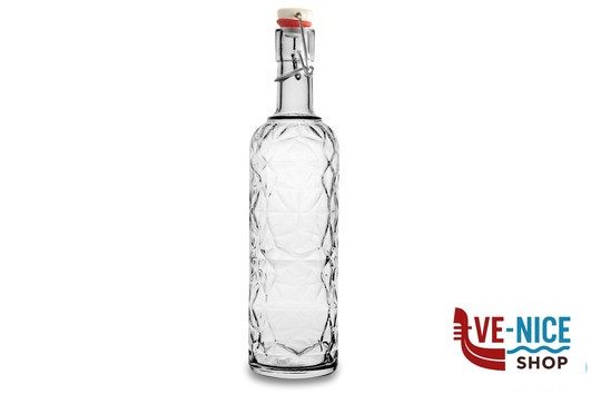 BOTTIGLIA IN VETRO LAVORATO TRASPARENTE CON TAPPO MECCANICO BIANCO