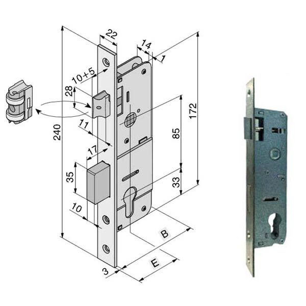 Serratura montanti alluminio infilare Frontale acciaio nichelato Senza incontro e rullo 1 mandata – Scrocco reversibile – Quadro mm 8 Scrocco regolabile intercambiabile Scatola mm 33/37/42/47×172 – Frontale mm 22×240 Entrata mm 20/25/30/35 – Cilindro 700 non incluso