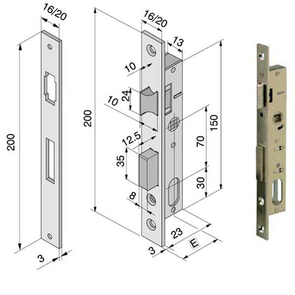 Serratura montanti alluminio infilare Acciaio nichelato – Incontro 1 mandata e scrocco reversibile – Quadro mm 8 Scatola mm 23×150 – Frontale mm 16/20×200 Entrata mm 15 – Cilindro serie 702 non incluso