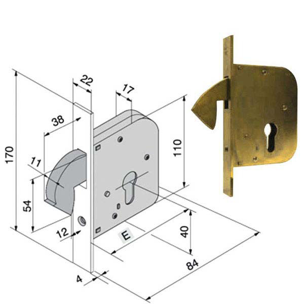 Serratura cancelli/porte ferro infilare Acciaio zincato tropicalizzato Gancio rientrante Scatola mm84x110 – Frontale mm 22×170 Entrata mm 50 – Cilindro serie 700 non incluso