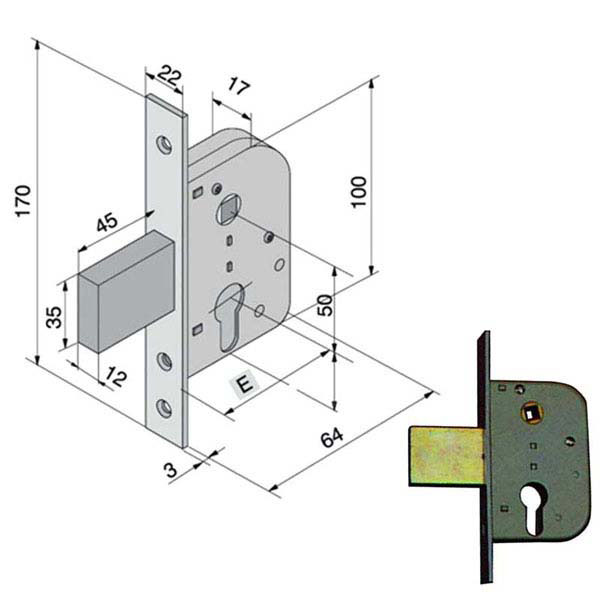Serratura cancelli/porte ferro infilare Acciaio zincato tropicalizzato Scrocco con dispositivo bloccaggio – Quadro mm 8 Scatola mm 64×100 – Frontale mm 22×170 Entrata mm 30 – Cilindro serie 700 non incluso